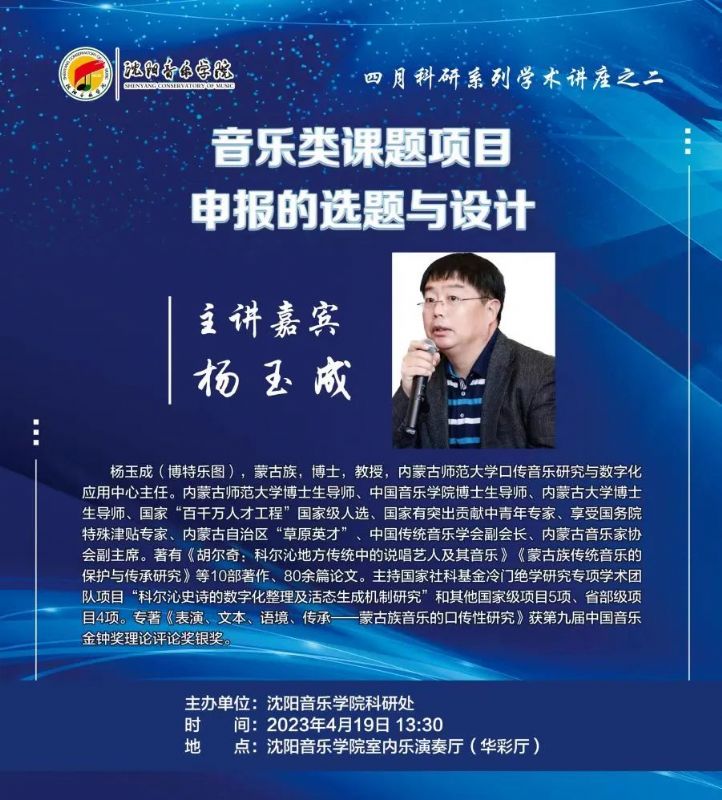 四月科研系列学术讲座(二)-----杨玉成《音乐类课题项目申报的选题与设计》