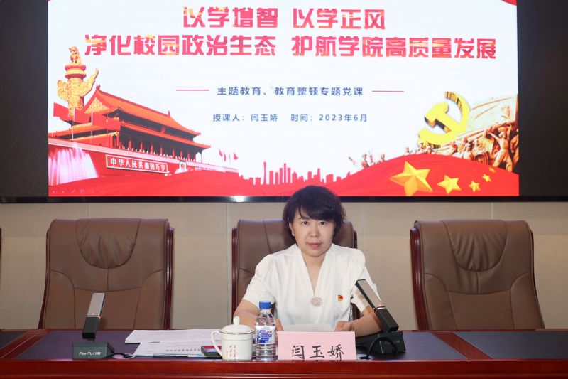 为深入开展学习贯彻习近平新时代中国特色社会主义思想主题教育,教育引导学院纪检监察干部以学铸魂、以学增智、以学正风、以学促干,推动纪检监察干部队伍教育整顿走深走实,6月30日,学院纪委书记、监察专员,主题教育领导小组副组长闫玉娇作题为《以学增智 以学正风 净化校园政治生态 护航学院高质量发展》的专题党课。