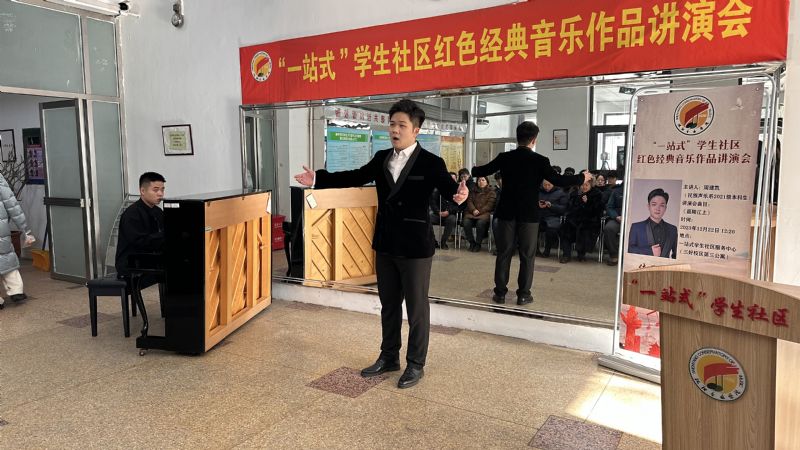 12月22日,第二十一期“一站式”学生社区红色经典音乐作品讲演会在三好校区“一站式”学生服务中心举行。学生处、民族声乐系相关负责同志及50余名学生代表参加讲演会。讲演会由民族声乐系辅导员易美含主持。