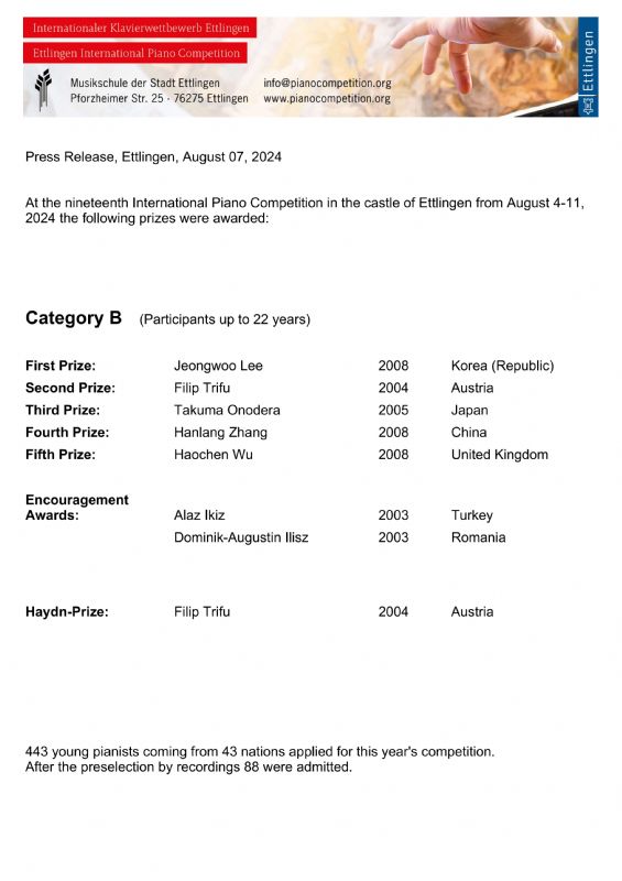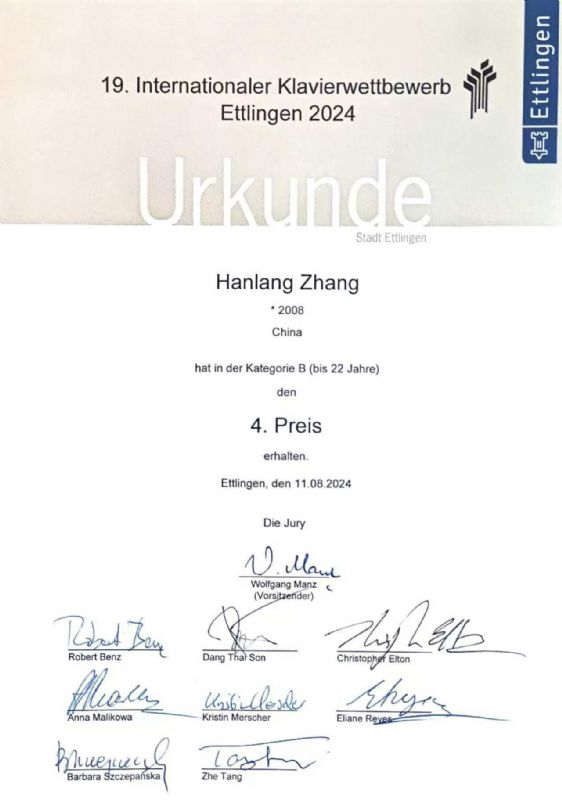 8月4日至11日,2024第19届德国“埃特林根”国际钢琴比赛在德国埃特林根市隆重举行。我院附属中等音乐学校钢琴专业高一年级学生张瀚朗(指导教师:李晓军)经过两轮比拼,最终获得第四名的优异成绩。