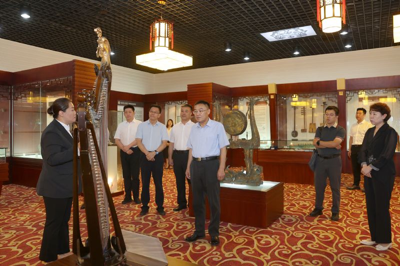 卢映川一行先后参观了学院校史馆、民族乐器陈列馆、音乐厅,详细了解了学院的发展历程和办学取得的成绩,参观了馆内收藏的汉族及各少数民族乐器。在音乐厅,卢映川一行详细了解了我院国家艺术基金项目、中俄建交75周年省州交响音乐会、“清风颂”大型廉政主题音乐会等大型演出、创作及国际交流等情况,观看了我院附中学生、近期在德国“埃特林根”国际钢琴比赛和中国音协“小金钟”钢琴比赛斩获殊荣的张瀚朗表演的钢琴独奏舒曼的《幻想小品集》Op.12第5首《在夜里》,青年教师李优、李超演唱的由学院党委书记赵恒心作词、教师吕威作曲,弘扬鲁艺传统、担当时代使命的歌曲《血脉》,并给予高度评价,鼓励他们坚持学习专业技能,夯实演唱、演奏基础,以过硬扎实的综合素养和业务本领,在新时代更好展现文艺工作者和艺术教育工作者的使命担当。