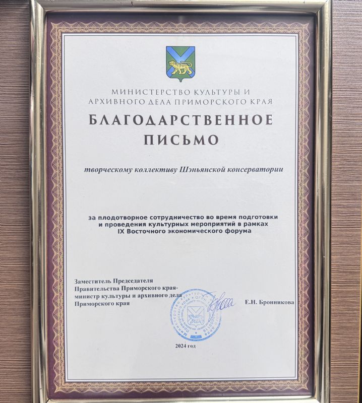 滨海边疆区政府副主席博罗尼科娃为我院颁发了由俄罗斯滨海边疆区州政府签署的荣誉证书和感谢信