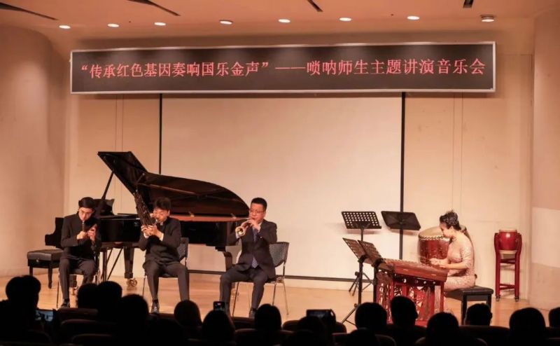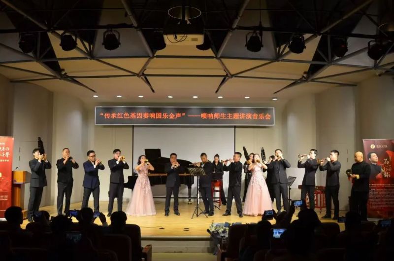 当晚,石海彬教授主持的“传承红色基因 奏响国乐金声”唢呐主题讲演音乐会精彩上演。石海彬教授的7名本科生和硕士研究生担任表演嘉宾,与我院优秀学生和优秀校友共同联袂演出。音乐会以传承红色基因为主题,将唢呐艺术与红色文化巧妙结合,彰显国乐的独特魅力。