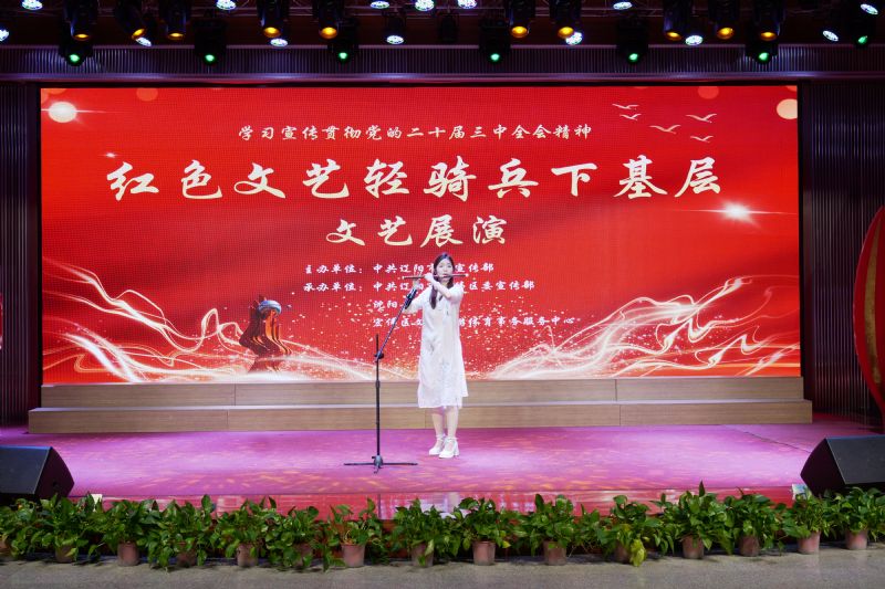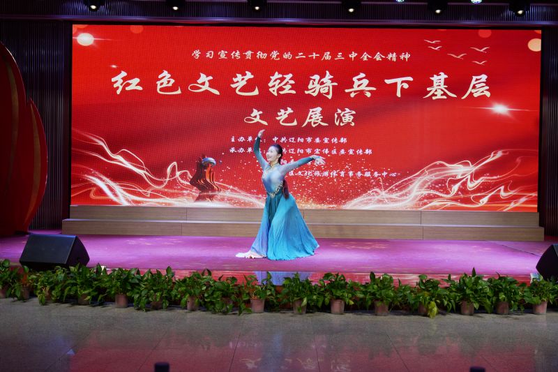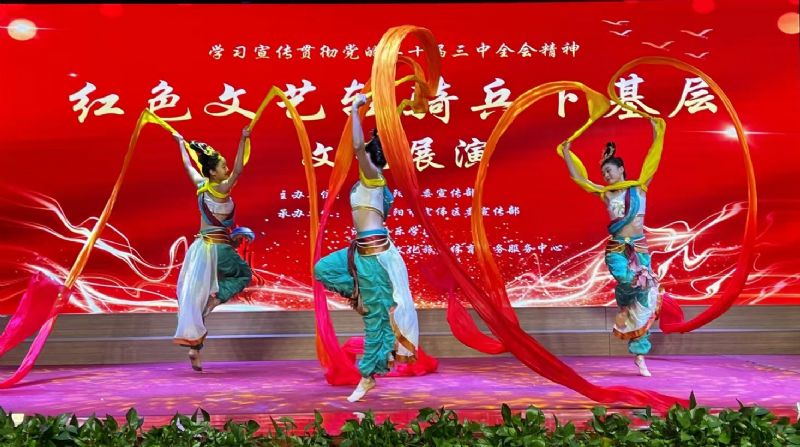 文艺展演在“红色文艺轻骑兵”小分队成员《灯火里的中国》深情悠扬的歌声中拉开了帷幕。竹笛独奏《万疆》,温婉细腻的曲调娓娓道来,优美的旋律充满蓬勃朝气和希望,表达出对祖国大地国泰民安的赞美之情。二胡演奏《光明行》以“中国气派”进行曲的形式,通过激昂有力的曲调和豪迈乐观的情绪,展现了人们对美好未来的向往和不断追求进步、趋向光明的愿望。 歌曲《新征程》是一首充满希望与励志之歌,号召广大人民群众为实现中华民族伟大复兴贡献力量;令人心潮澎湃的歌曲《红旗飘飘》,旋律深情激昂,表达了对祖国的深厚热爱和赤诚之心。独舞《远方》展现出蒙古族舞蹈浑厚、含蓄、舒展和豪迈的特点,展现了蒙古族人民的豪放性格与坚毅勇敢,表达了草原儿女对远方的憧憬与向往。三人舞《闻法飞天》是根据敦煌壁画盛唐时期的六臂飞天形象改编而成,以红、蓝、绿色长达二十四米的彩绸,夸张地将飞天振臂高飞的欢畅情绪一步步推向高潮。每个节目既有特色,又能引起观众共鸣,现场掌声阵阵,观众热情高涨。展演在激情澎湃的大合唱《中国向前进》中落下帷幕。