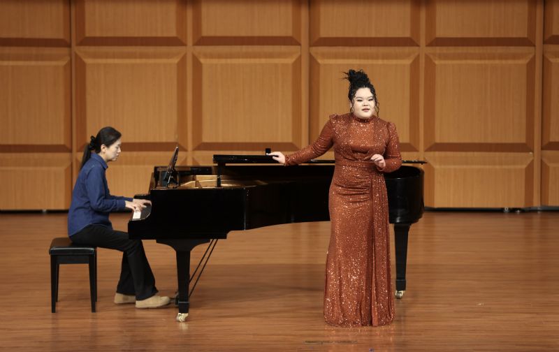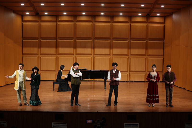 钢琴独奏《中国之梦》,则以磅礴旋律抒发家国情怀。单簧管独奏《小协奏曲》通过灵动跳跃与抒情演奏,传递出古典与浪漫交织的隽永意趣。爵士风的歌曲演唱《A Song For You》,表现力丰富、风格迥异的演唱形式凸显学院多元化人才培养成果。巴扬独奏《魔鬼音程之舞》展现了这一俄罗斯民族乐器的独特表现力,令观众耳目一新。来自声乐歌剧系的六名研究生共同演唱的歌剧《婚姻的契约》选段,华丽的花腔技巧与默契的和声演唱展现了意大利歌剧的独特魅力。演出尾声,全体演员与观众齐声合唱《我和我的祖国》,激昂的旋律凝聚起强烈的情感共鸣,舞台上下以歌传情,将演出气氛推向高潮。