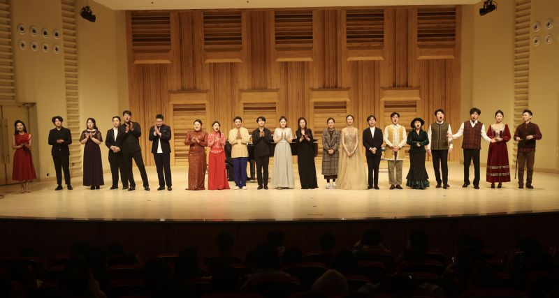 演出涵盖民族声乐演唱、民族器乐和管弦乐演奏、歌剧、音乐剧、钢琴、巴扬演奏等多种艺术表演形式,演出既展现了西方古典音乐艺术魅力,又彰显了中华优秀传统文化的丰厚底蕴。演出在独唱《斗牛士之歌》雄浑激昂的歌声中拉开序幕,随后,钢琴独奏《斯克里亚宾前奏曲集》,演奏者用精湛的技巧诠释了浪漫主义至神秘主义的风格跨越;一曲《山丹丹开花红艳艳》,高亢悠扬的歌声唱出了信天游跌宕的声情和黄土地的炽烈情怀;二胡与竹笛重奏《陌上花开》,通过二胡的婉转绵长与竹笛的清亮灵动交织,展现出自然与人文交融的盎然诗意。小提琴独奏《引子与回旋随想曲》,通过小提琴的深沉抒情与激情奔放的技巧对比,交织出浪漫主义的诗意与戏剧性的张力。东北民歌《双回门》,以诙谐生动的表演展现出东北地区独具特色的地域文化。笙独奏《甘榜印象》则以笙的丰富和声与悠扬音色,刻画出田园生活的质朴欢愉,展现出传统与现代交织的民俗画卷。音乐剧《剧院魅影》经典唱段《夜之乐章》,将古典美声与现代流行音乐完美融合,表现出独特的音乐风格。