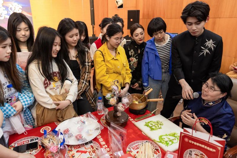 台上展演精彩纷呈,台下互动热闹非凡。演出结束后,师生们还在现场观看了非物质文化遗产展示。沈阳地区独具特色的非物质文化遗产——面人、糖人、绳结、草编、剪纸等传统手工艺在现场大放异彩。这些承载着辽沈大地文化基因的民间艺术,以其精湛的技艺和独特的魅力深深吸引了我院师生。大家纷纷驻足观赏,更积极投入到互动体验中,在亲手实践中感受传统工艺的精妙所在。