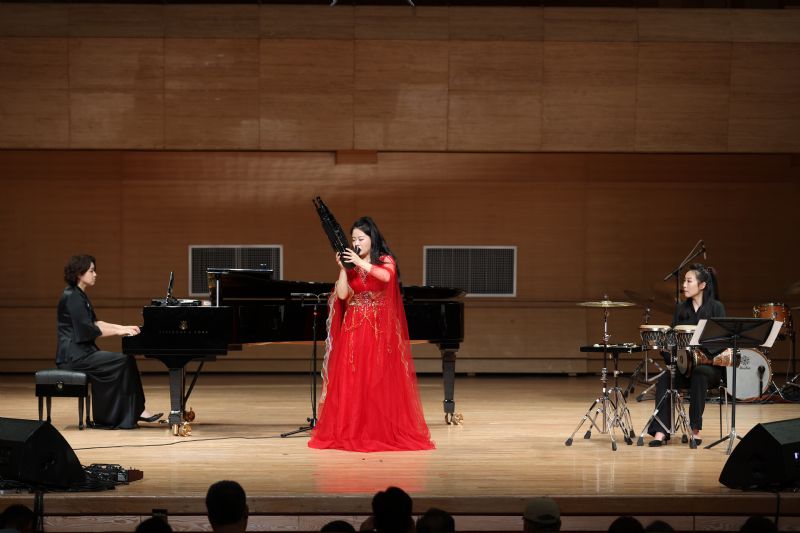 音乐会在打击乐重奏《千佛手》中拉开帷幕,演奏者与打击乐团成员默契配合,在鼓点与铜钹的碰撞中,构建出庄严肃穆又充满活力的奇妙音乐空间。钢琴独奏《戈雅之画-情话》,琴音时而如私语呢喃,时而激情迸发,以细腻的触键勾勒出西班牙画家戈雅笔下的浪漫情愫。随后的二胡独奏《第六二胡狂想曲》,演奏者运弓如椽,时而如疾风骤雨般气势磅礴,时而似幽谷回响般深邃悠远,彰显出二胡演奏的独特表现力。扬琴独奏《雅乐清歌》,清泉般的音符从演奏者的手中流淌而出,既有古代文人的雅致风骨,又融入现代音乐的编曲巧思,让千年雅乐焕发现代生机。笙独奏《胡旋・胡旋》则带来别样的西域风情,演奏者以精湛的循环换气技法,模拟出胡旋舞的急速旋转,仿佛重现敦煌壁画中的盛世乐舞。二胡独奏《雪山魂塑》以磅礴气势描绘长征精神;唢呐独奏《百年涅槃》用嘹亮音色诉说民族复兴历程;琵琶独奏《静默之弦》在拨挑勾画间演绎东方美学。