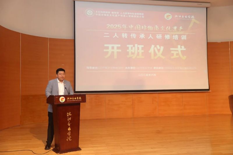 张策在致辞中强调了非遗研培是学院积极响应国家战略、担当文化使命的重要举措。他指出,学院自2018年获批成为“中国非遗传承人群研培计划参与院校”以来,非遗研培工作便成为学院“培根铸魂”的核心工程之一。二人转作为东北文化“精神标识”,其传承发展对修复乡村文化生态、延续民俗记忆意义重大。他希望参培学员能够坚定文化自信、以学术夯实根基、以创新拓展路径。他表示,学院将持续发挥资源优势,为非遗保护提供“沈音方案”,助力二人转在新时代焕发新的生机与活力。