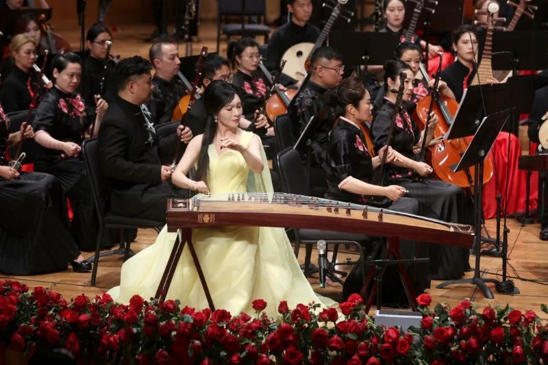 音乐会还巧妙融合传统器乐与当代创作思维,竹笛、琵琶、二胡与乐队联袂演绎《紫竹》,乐曲以江南丝竹为底色,三件主奏乐器交织出烟雨楼台的灵动画卷,展现新时代中国的蓬勃气象。古筝协奏曲《兰亭》以音韵摹写书圣王羲之笔下流觞曲水的魏晋风骨,千年文脉跃然弦上。