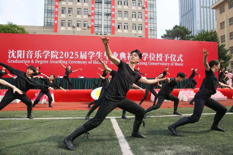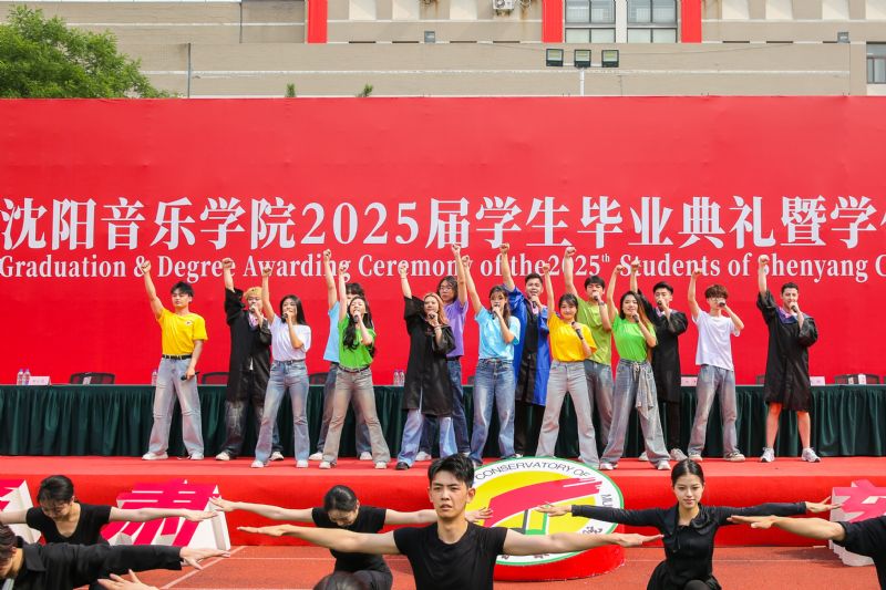 典礼开始前,“川子唢呐”——2015届校友孙名川与民族器乐系14名学生、现代音乐学院4名学生联袂演奏电影《哪吒·魔童闹海》主题曲《就是哪吒》,高亢嘹亮的唢呐声与动感十足的电音节奏激情碰撞,展现了民族乐器与现代电音的完美融合,瞬间点燃全场的激情。“少年应有鸿鹄志,敢踏风浪破苍穹”,随后舞蹈学院40名学生表演了洒脱俊美的蒙古族舞蹈,他们扬臂似鸿雁高飞,轻踏如骏马踱步,既象征着2025届毕业生“天高任鸟飞”的宽广未来,也寓意着毕业生们“骏马踏平川”的美好图景。“踏浪驭飞舟、千帆竞出征”,现代音乐学院、国际教育学院15名学生与声乐歌剧系8名学生梦幻联动合唱歌曲《当离别开出花》《未来我来》,流行韵律交织美声咏叹,时尚与古典共鸣,唱出了沈音学子逐梦前行、奔赴山海的自信从容和未来我来、勇担使命的挺膺担当。全体毕业生牢记母校嘱托,传承红色基因,赓续红色血脉,在民族复兴的征程上展现沈音学子的青春风采,施展艺术才华报效家国。