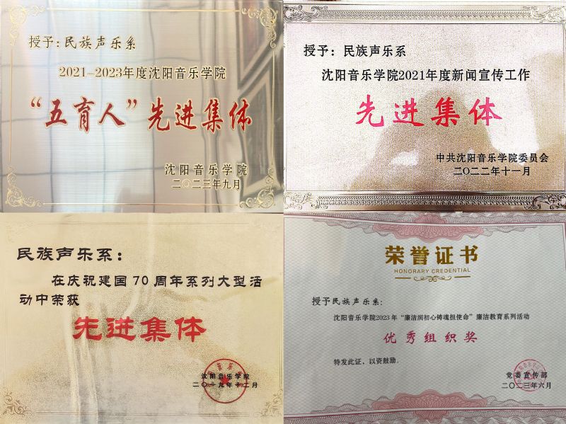 近年来,民族声乐系党总支荣获沈阳市“先进党支部”“首批党支部规范化建设示范点”;国产一区二区日本在线“五育人先进集体”“先进基层党组织”“宣传新闻工作先进集体”等称号,“堡垒巩固工程”“共产党员先锋工程”“廉洁文化建设创新工程”荣获院级一、二、三等奖。师生荣获省市院级多项荣誉,其中辽宁省教学名师1人、辽宁省优秀教师1人、辽宁省优秀共产党员1人、辽宁省“百千万人才工程”百层次人才2人,获辽宁省高校示范微党课一等奖、辽宁省高校组织员素质能力大赛三等奖、“玫瑰书香”全省女职工主题阅读活动三等奖,荣获沈阳市优秀研究生辅导员1人、沈阳市优秀辅导员1人、全国百名研究生党员标兵1人、沈阳市优秀研究生1人。