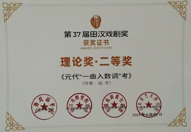 白宁教授《元代“一曲入数调”考》获第37 届田汉戏剧奖理论奖·二等奖