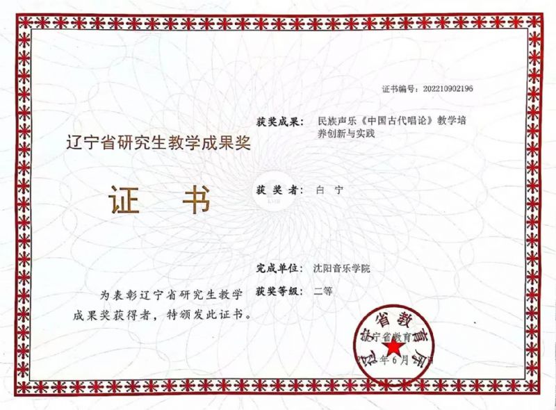 白宁教授民族声乐《中国古代唱论》教学培养创新与实践获省级二等奖