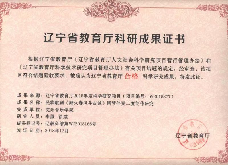 匡祎教授“双一流”建设项目——复排歌剧《伤逝》项目结项证书