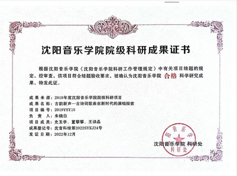 科研创新是民族声乐系高质量发展的动力源泉。近年来,民族声乐系鼓励教师积极开展学术科研活动,成果斐然。系内教师主持并参与国家级课题两项、省级课题十余项,市级院级课题三十余项,申请多项院级教材立项。近年来完成学院“双一流”建设项目两项,2025年成功申报学院“双一流”建设项目3项;在国家级和省级一类期刊发表多篇学术论文,出版多部专著。白宁教授撰写的论文《元代“一曲入数调”考》获田汉戏剧奖(全国戏剧期刊联盟)·理论奖二等奖。