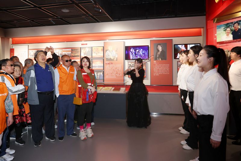 老人们在志愿者的搀扶下从电梯内缓缓走出,扑面而来的是轻柔的小提琴声《让世界充满爱》。老人们走入沈音校史馆,讲解员以生动的语言,带领他们“触摸”了沈音从鲁艺创立到辗转北迁、扎根沈阳,筚路蓝缕、砥砺奋进的发展历程,来自声乐歌剧系、民族声乐系、管弦系、音乐教育学院的师生们现场为老人们演绎了不同历史时期鲁艺人创作的红色经典文艺作品。《南泥湾》《白毛女》《东方红》《革命人永远是年轻》《红梅赞》《我和我的祖国》等熟悉的旋律接连响起。一件件历史故事与艺术成就的讲述,融入跨越时代的歌声,以沉浸式的艺术体验唤醒了老人们的集体记忆。老人们高声跟唱,并表示那是他们听过的最幸福愉快的心声。